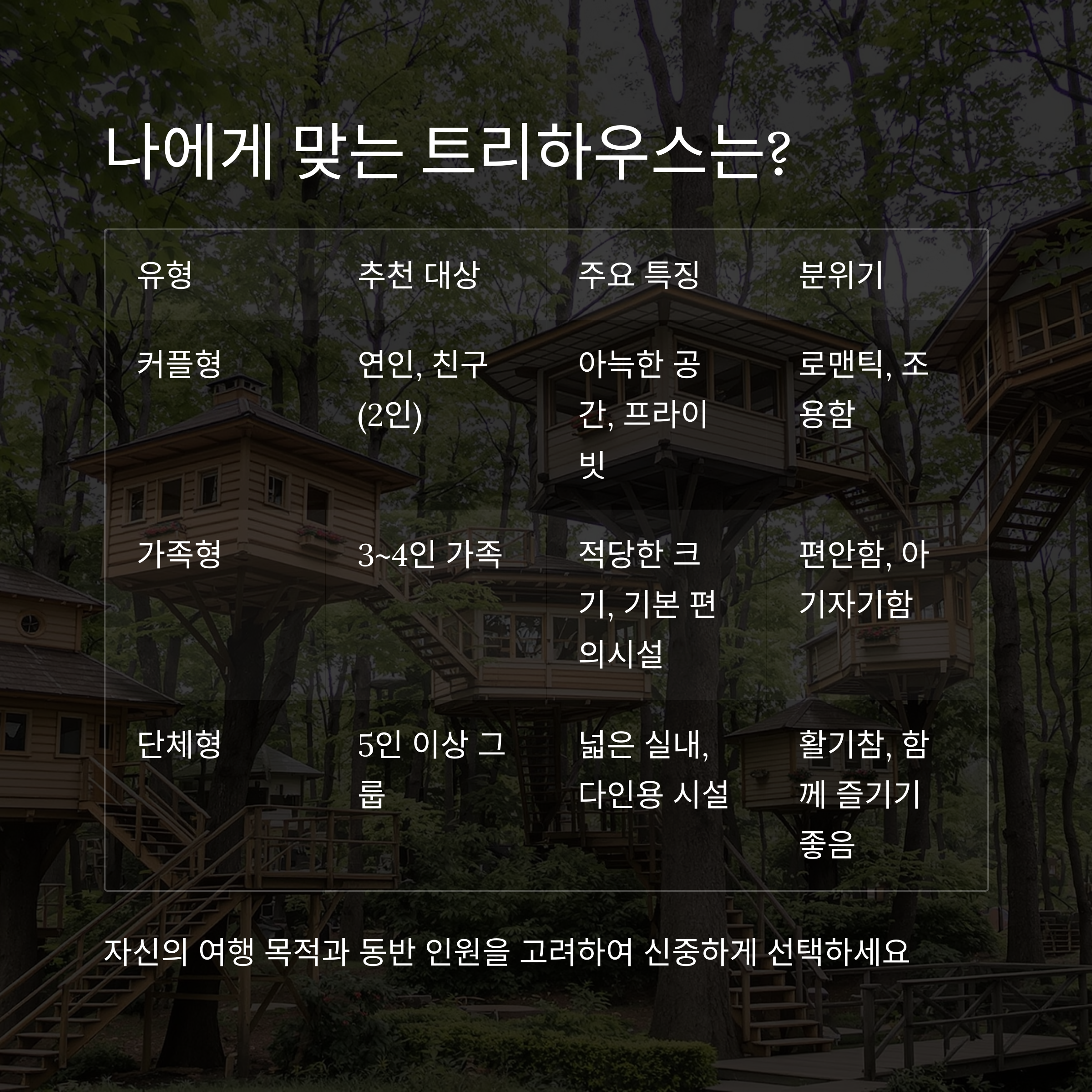 | 트리하우스 유형 | 추천 대상 | 주요 특징 | 분위기 |