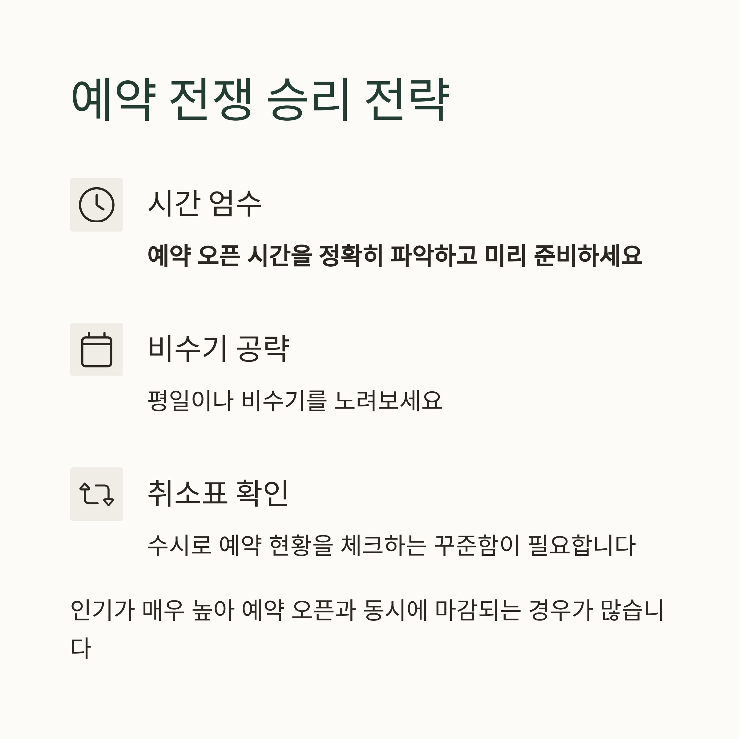 A: 가장 중요한 것은 예약 오픈 시간을 정확히 파악하고 미리 준비하는 것입니다. 또한, 평일이나 비수기를 공략하는 것도 좋은 방법입니다.