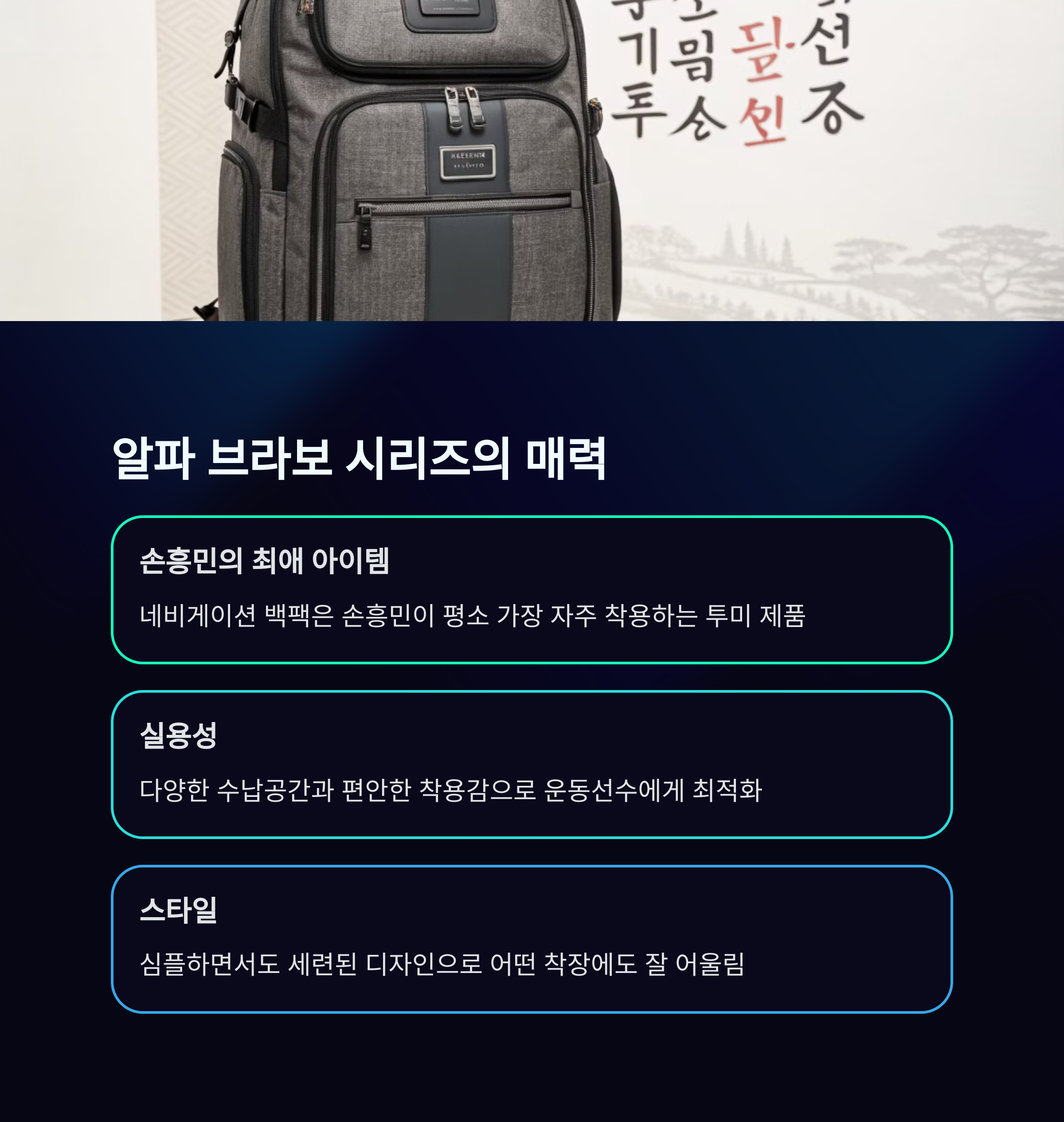 손흥민은 글로벌 앰버서더로 활동 중인 투미(TUMI) 브랜드의 제품을 자주 사용합니다. 특히, 알파 브라보 네비게이션 백팩테그라-라이트 캐리어를 애용하는 것으로 알려져 있습니다.