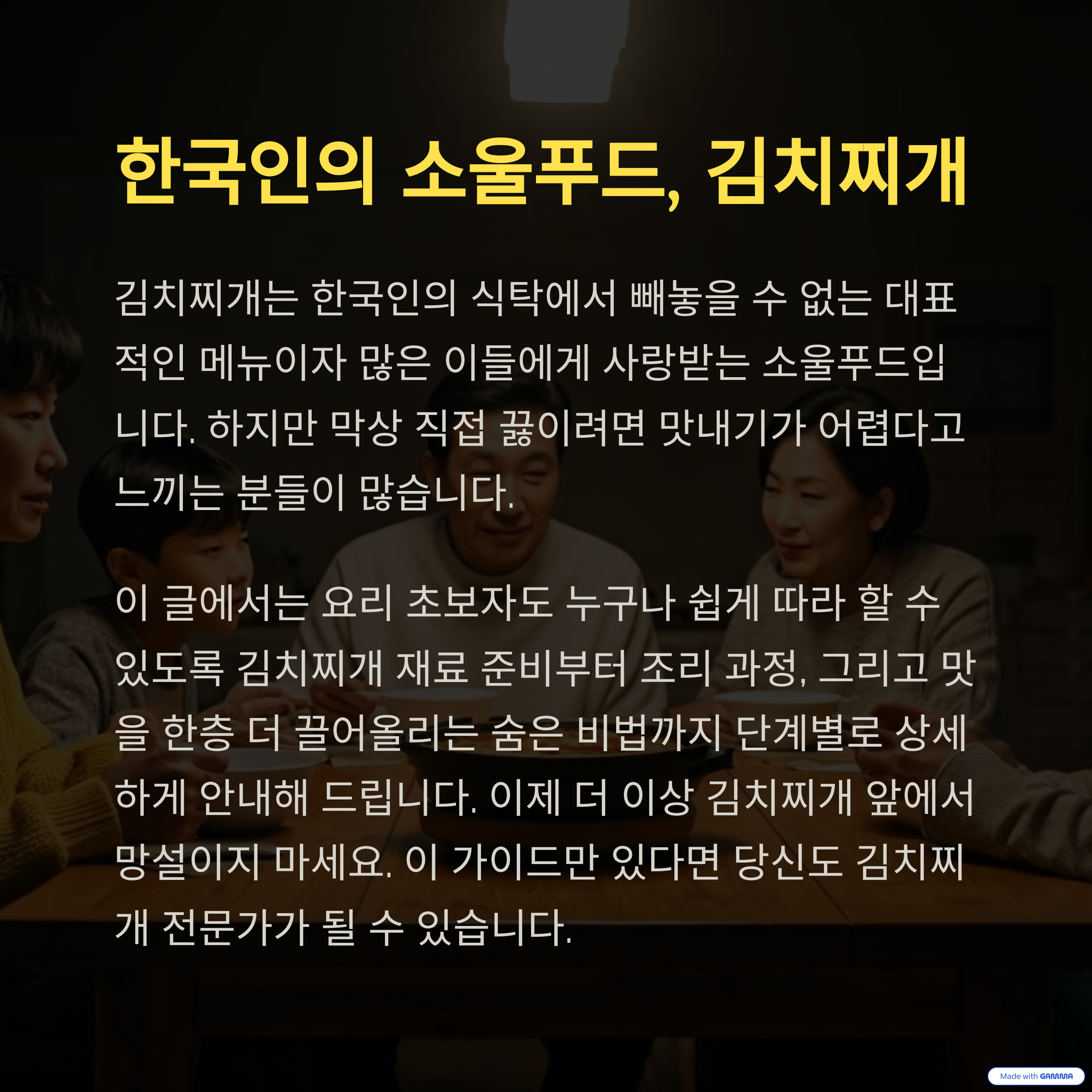 김치찌개는 한국인의 식탁에서 빼놓을 수 없는 대표적인 메뉴이자 많은 이들에게 사랑받는 소울푸드입니다. 하지만 막상 직접 끓이려면 맛내기가 어렵다고 느끼는 분들이 많습니다. 이 글에서는 요리 초보자도 누구나 쉽게 따라 할 수 있도록 김치찌개 재료 준비부터 조리 과정, 그리고 맛을 한층 더 끌어올리는 숨은 비법까지 단계별로 상세하게 안내해 드립니다. 이제 더 이상 김치찌개 앞에서 망설이지 마세요. 이 가이드만 있다면 당신도 김치찌개 전문가가 될 수 있습니다.
