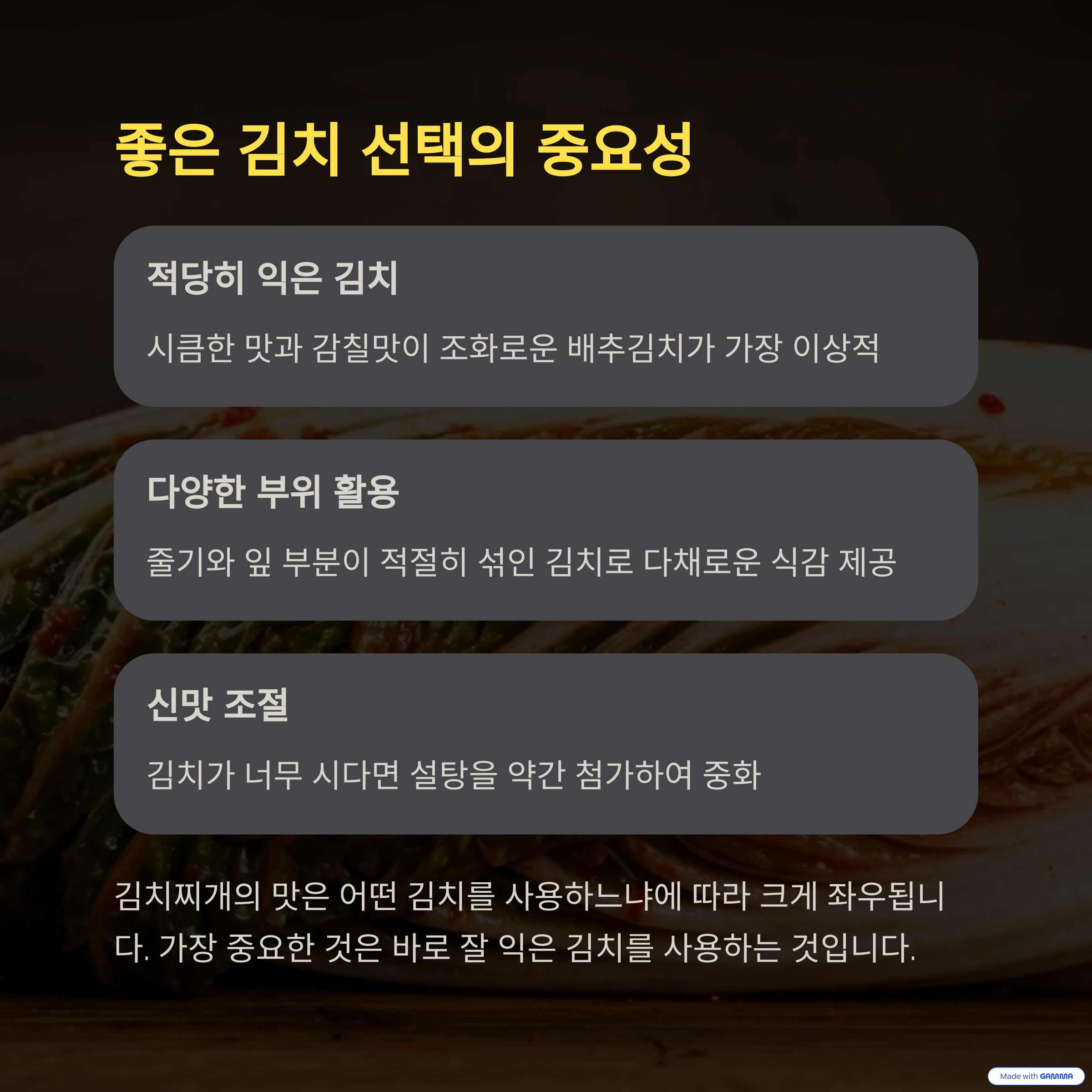 김치찌개의 맛은 어떤 김치를 사용하느냐에 따라 크게 좌우됩니다. 가장 중요한 것은 바로 잘 익은 김치를 사용하는 것입니다. 너무 생김치이거나 과도하게 익어 군내가 나는 김치는 피하는 것이 좋습니다. 적당히 익어 시큼한 맛과 감칠맛이 조화로운 배추김치가 김치찌개용으로 가장 이상적입니다. 줄기 부분과 잎 부분이 적절히 섞인 김치를 사용하면 더욱 다채로운 식감을 즐길 수 있습니다. 만약 김치가 너무 시다면 설탕을 아주 약간 첨가하여 신맛을 중화시킬 수 있습니다.