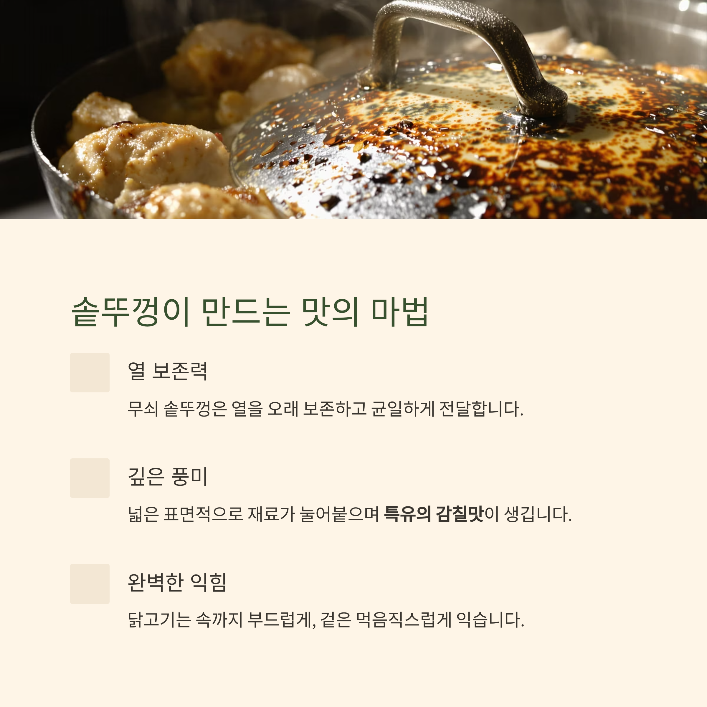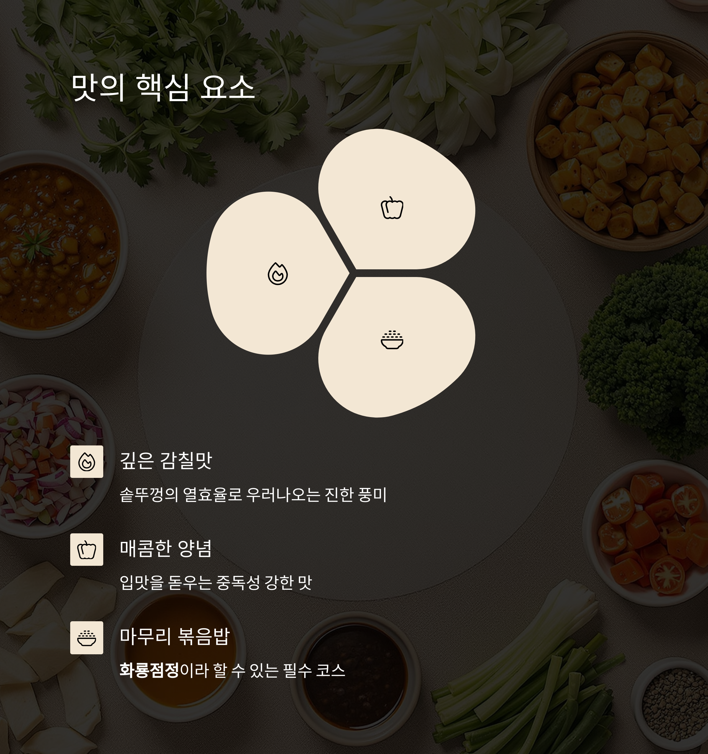 | 깊은 감칠맛 | 솥뚜껑의 열효율과 재료의 조화로 우러나오는 진한 풍미 | ★★★★★ |