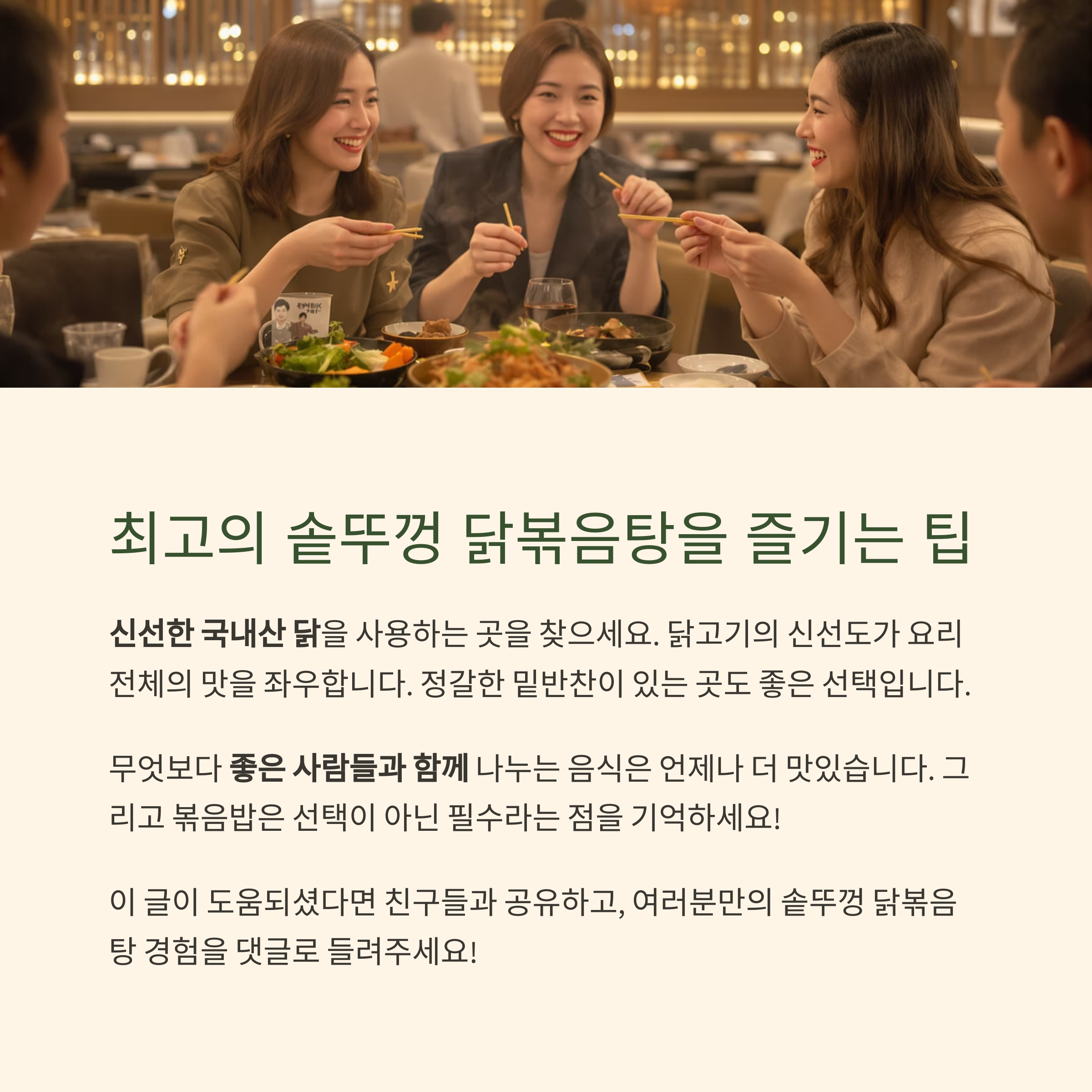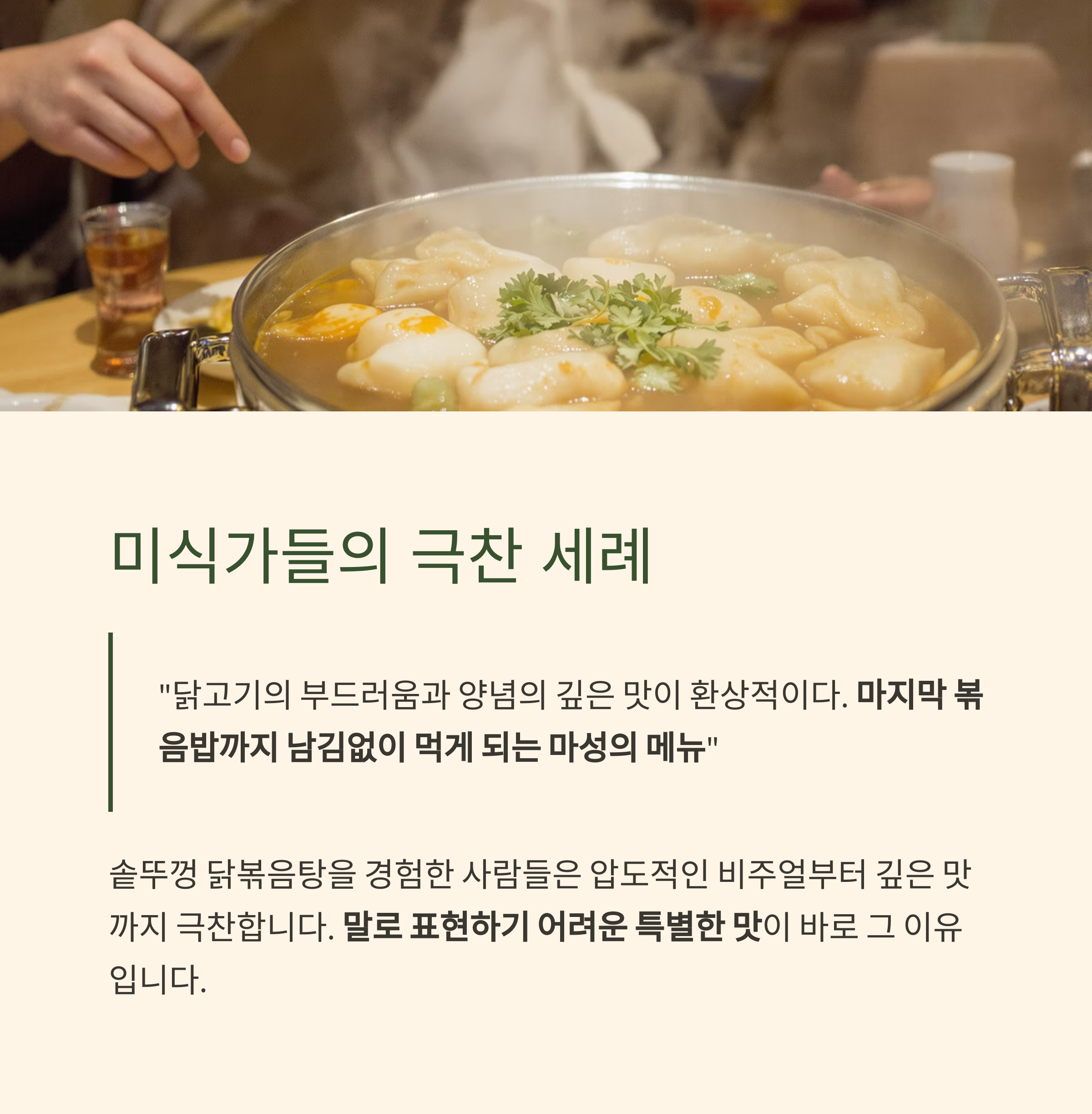 이처럼 직접 경험한 이들의 생생한 후기는 솥뚜껑 닭볶음탕에 대한 기대감을 더욱 높여줍니다.