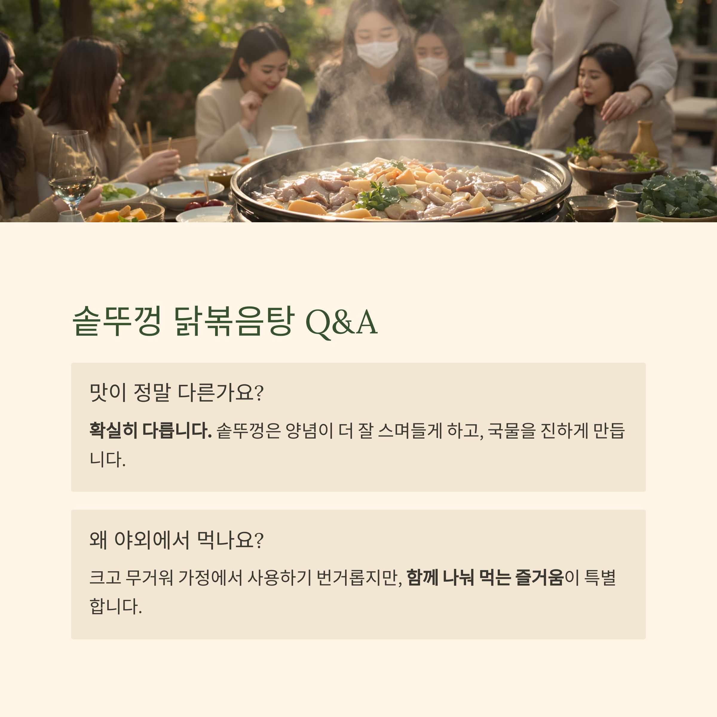 Q: 솥뚜껑 닭볶음탕은 왜 야외나 식당에서 주로 먹나요?