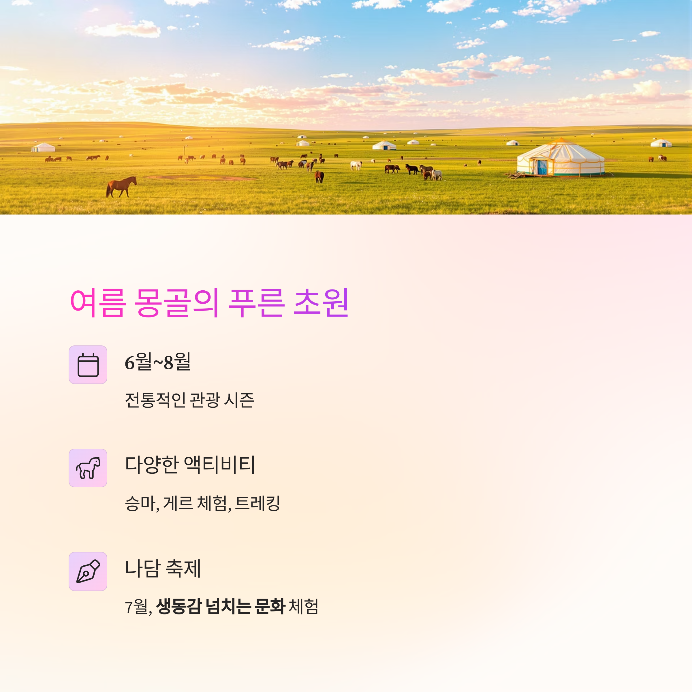 여름 (6월~8월): 나담 축제 (7월), 승마, 트레킹, 게르 체험 등 야외 활동 최적기. 가장 활기찬 시즌입니다.