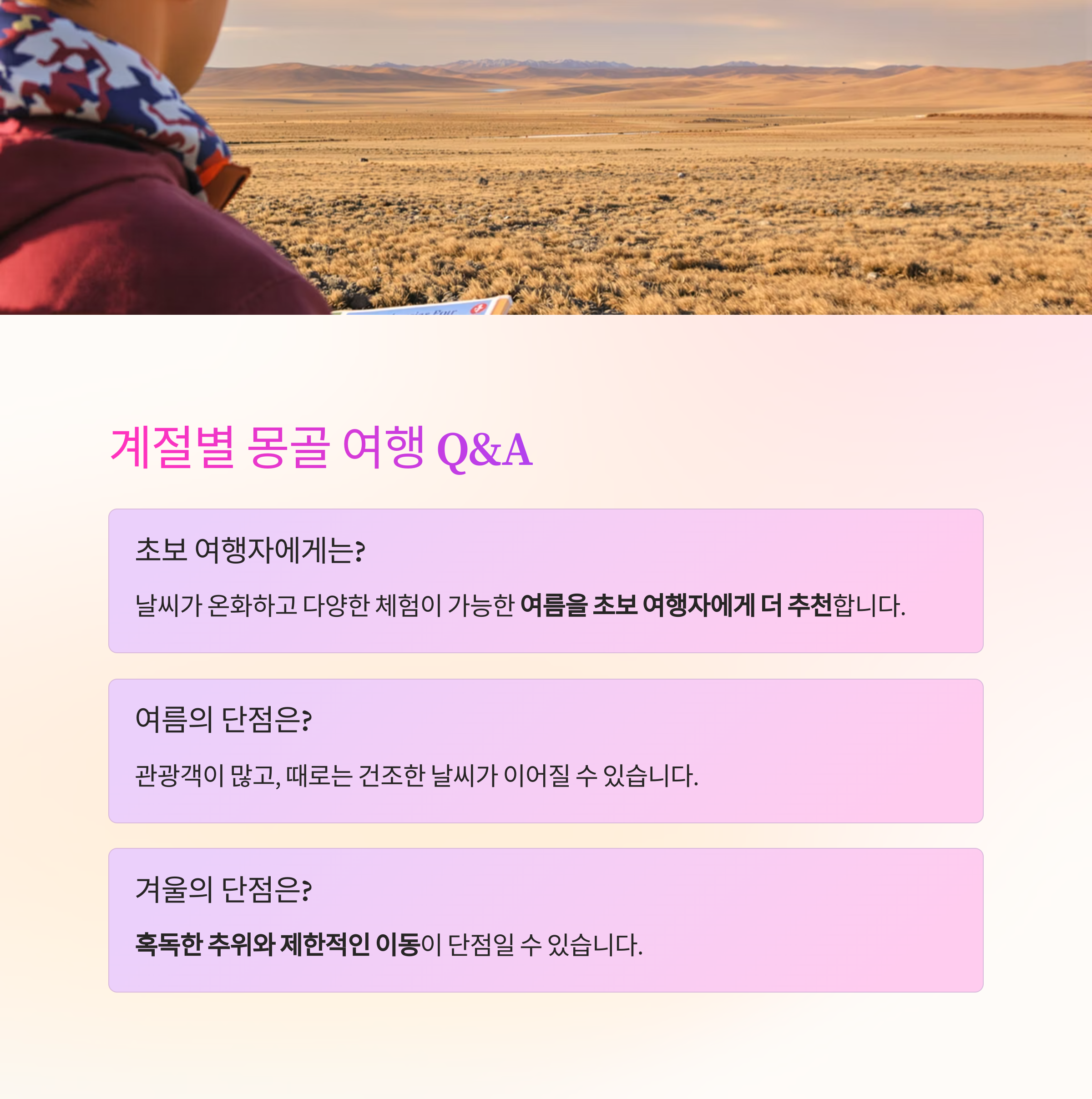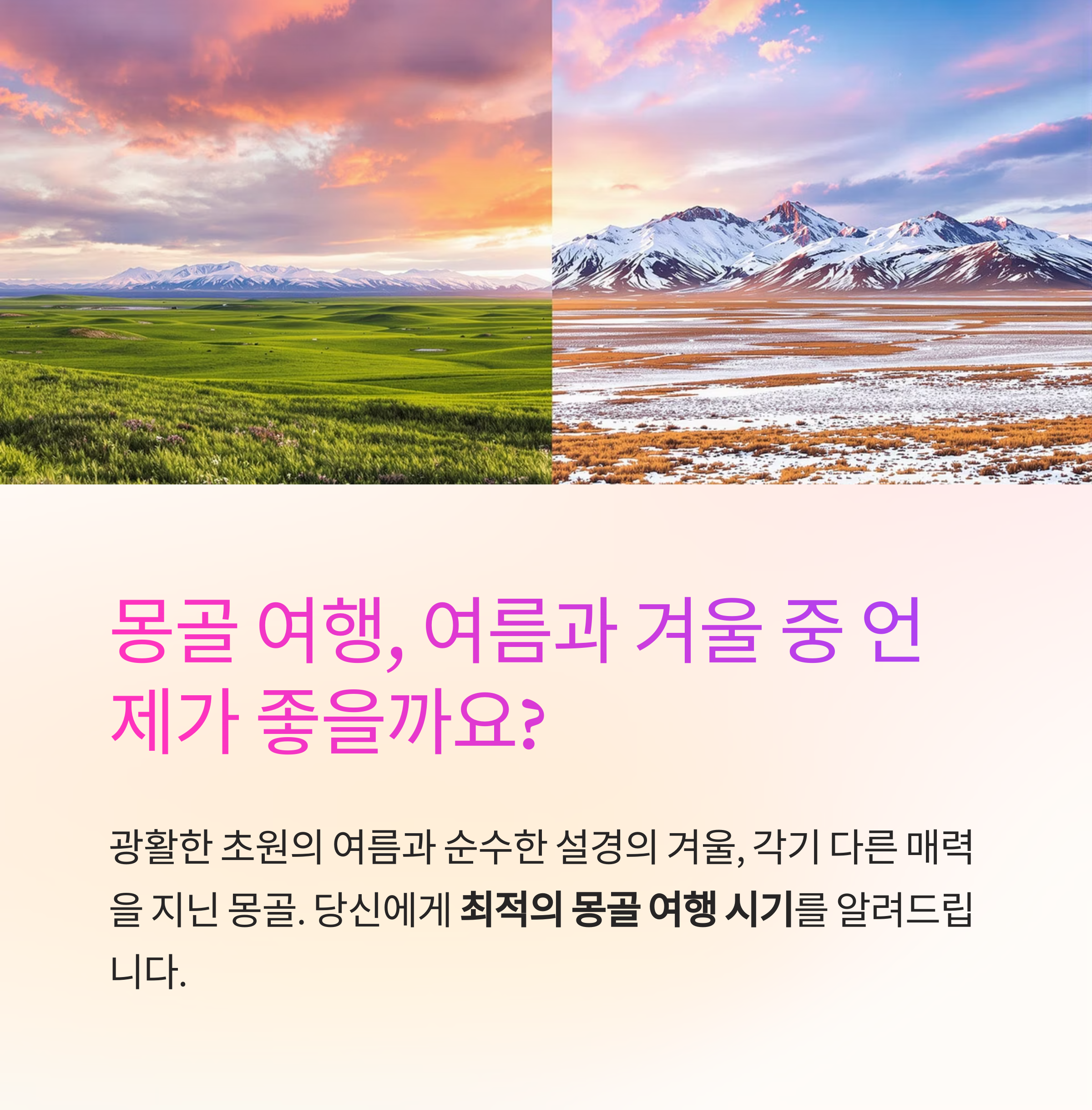 여행자: "몽골 여행을 계획 중인데, 여름과 겨울 중 언제가 더 좋을지 고민이에요.