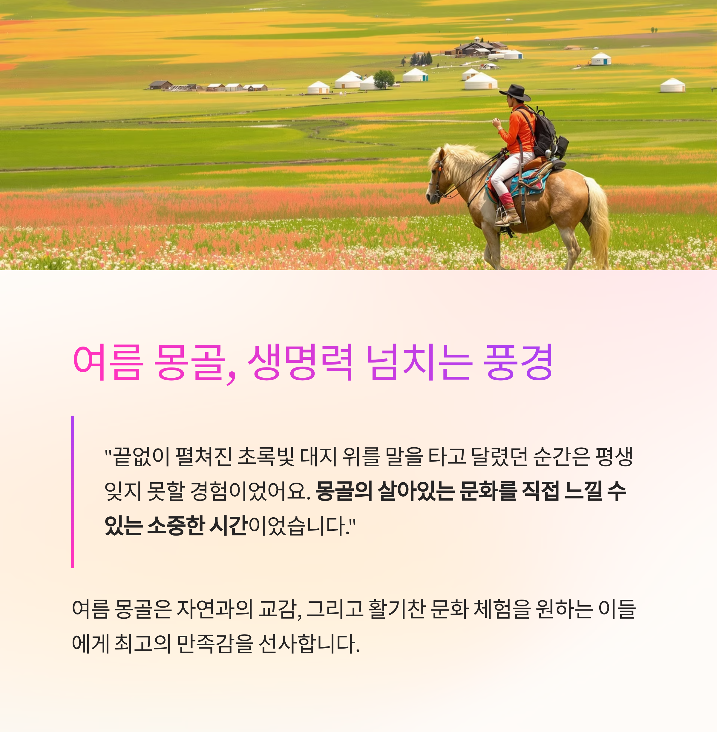 ""끝없이 펼쳐진 초록빛 대지 위를 말을 타고 달렸던 순간은 평생 잊지 못할 경험이었어요.