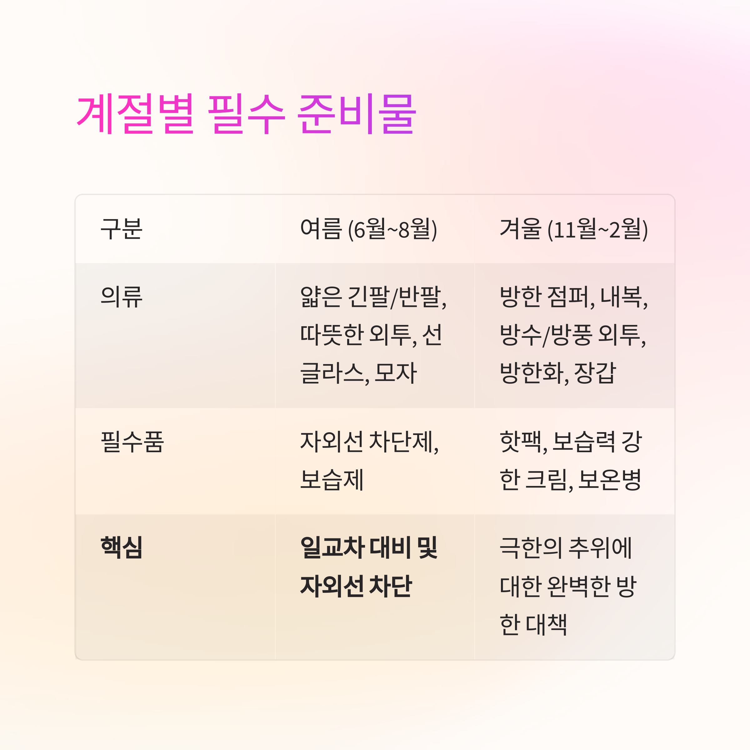 | 기타 필수품 | 자외선 차단제, 보습제, 상비약 | 핫팩, 보습력이 강한 크림, 동상 예방 용품, 보온병 |