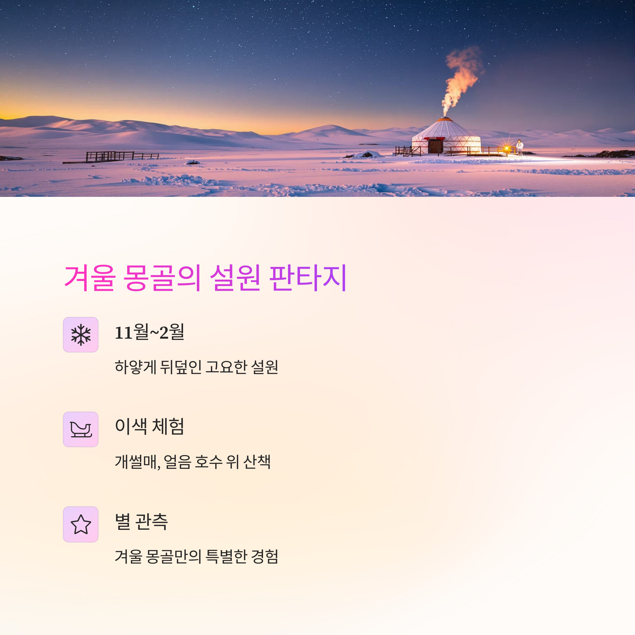 여행의 목적, 개인의 취향, 그리고 추위에 대한 적응력 등을 종합적으로 고려하여 가장 만족스러운 몽골 여행을 계획해 보시길 바랍니다.