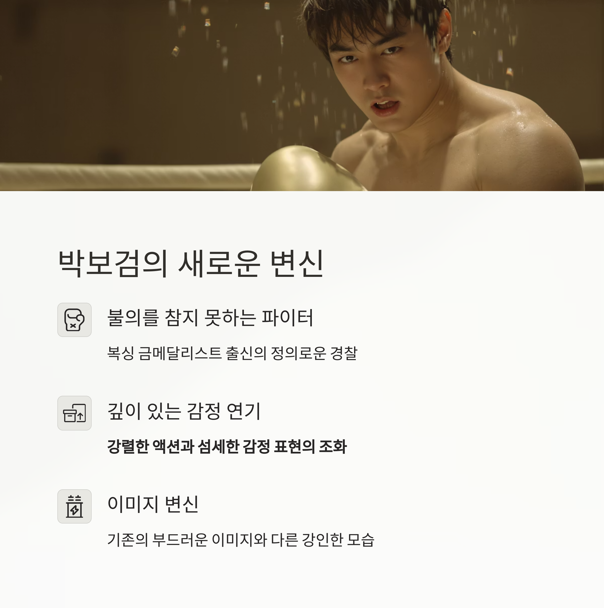 좌절을 겪고 경찰로서 제2의 인생을 시작하는 인물로, 박보검 배우의 깊이 있는 감정 연기와 강렬한 액션을 동시에 볼 수 있을 것으로 기대됩니다.