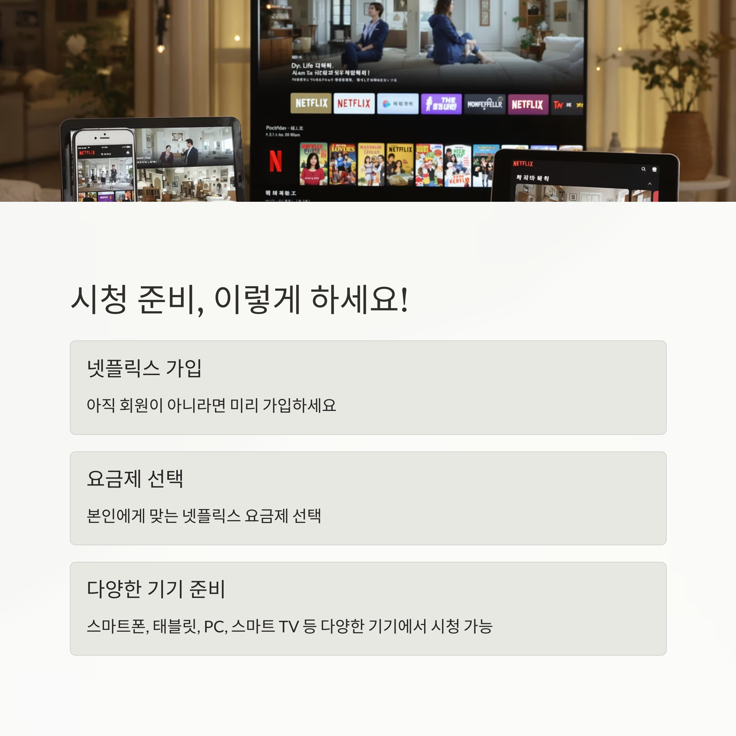 스마트폰, 태블릿, PC, 스마트 TV 등 다양한 기기에서 넷플릭스 시청이 가능합니다.