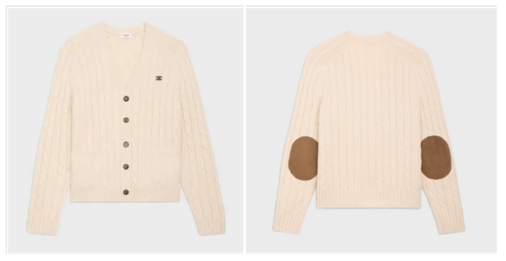 클래식한 꽈배기 디테일이 돋보이는 캐시미어 가디건으로, 가슴 부분의 트리옹프 장식과 소매 뒷면의 패치