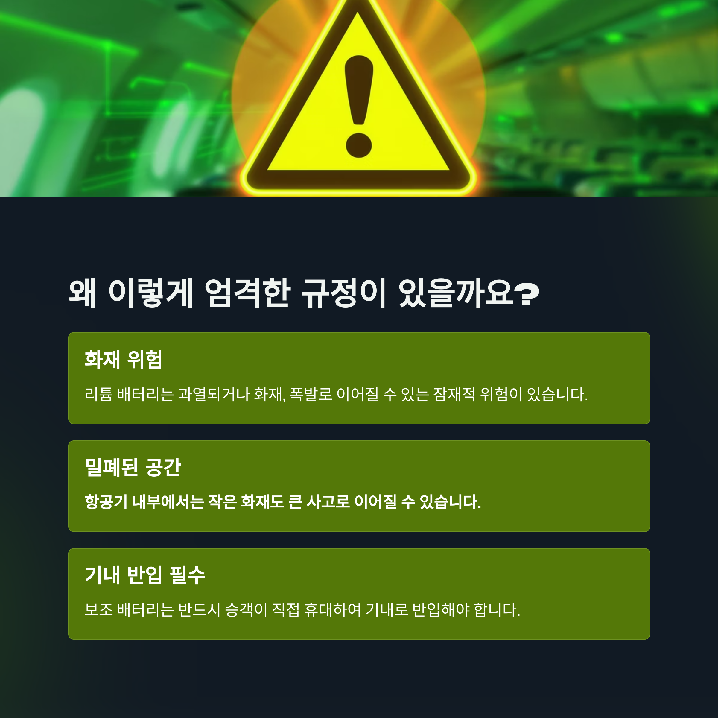 보조 배터리는 우리 일상에서 매우 유용하게 사용되지만, 항공 안전에 있어서는 특별한 주의가 필요한 물품입니다.