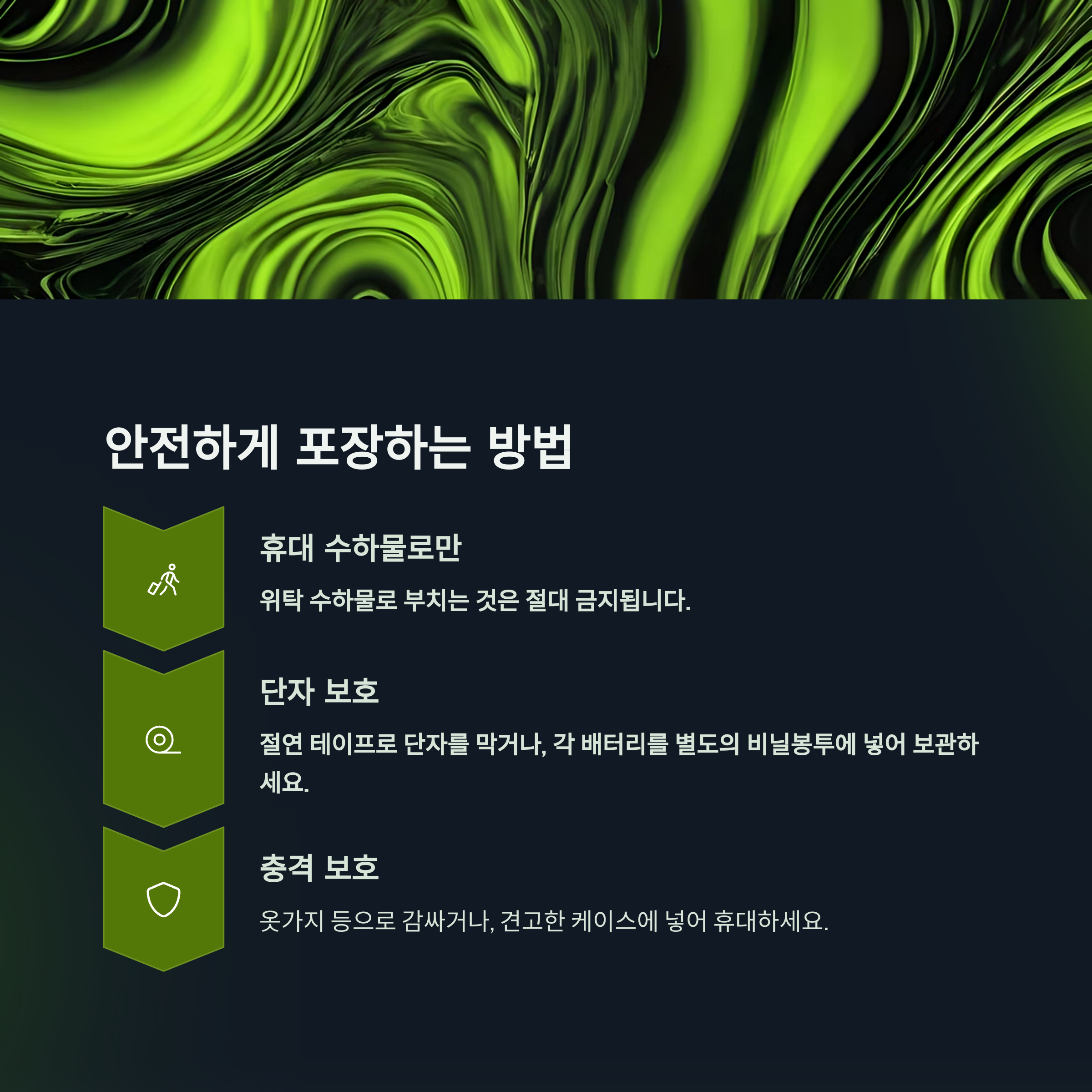 - 배터리 상태 점검: 손상되거나 부풀어 오른 배터리는 절대 반입 금지입니다.