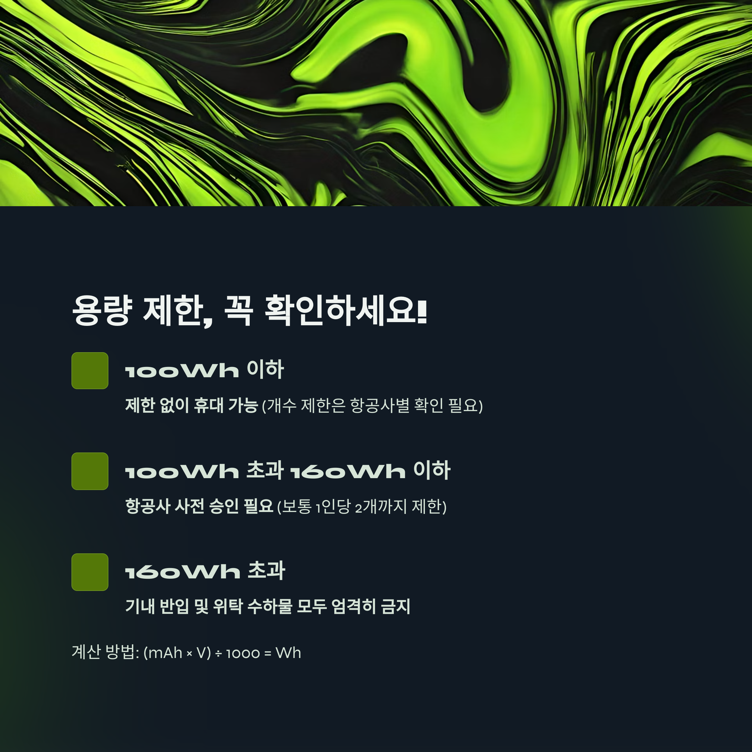 | 용량 (Wh) | 반입 규정 | 비고 |