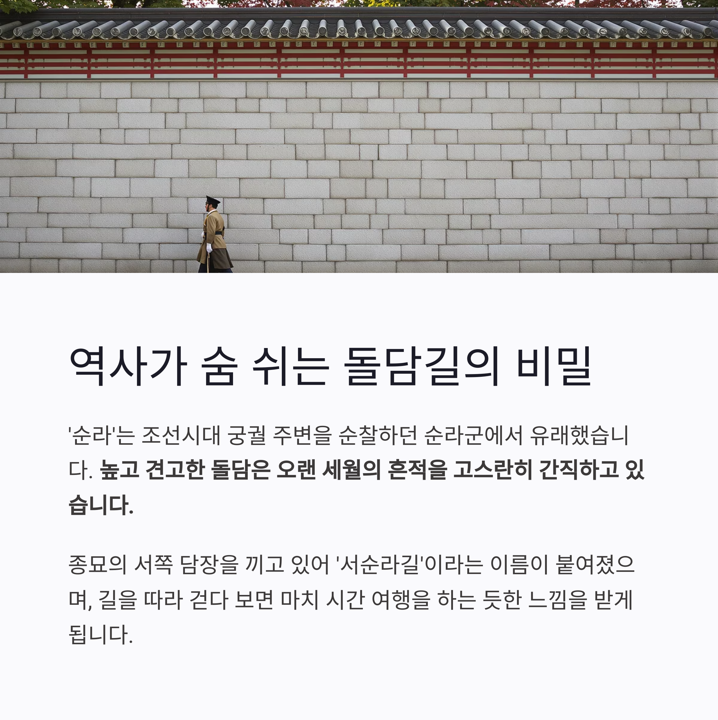이 길은 종묘를 보호하고 외부의 침입을 막는 중요한 역할을 수행했던 곳으로, 그 역사적 의미가 깊습니다.