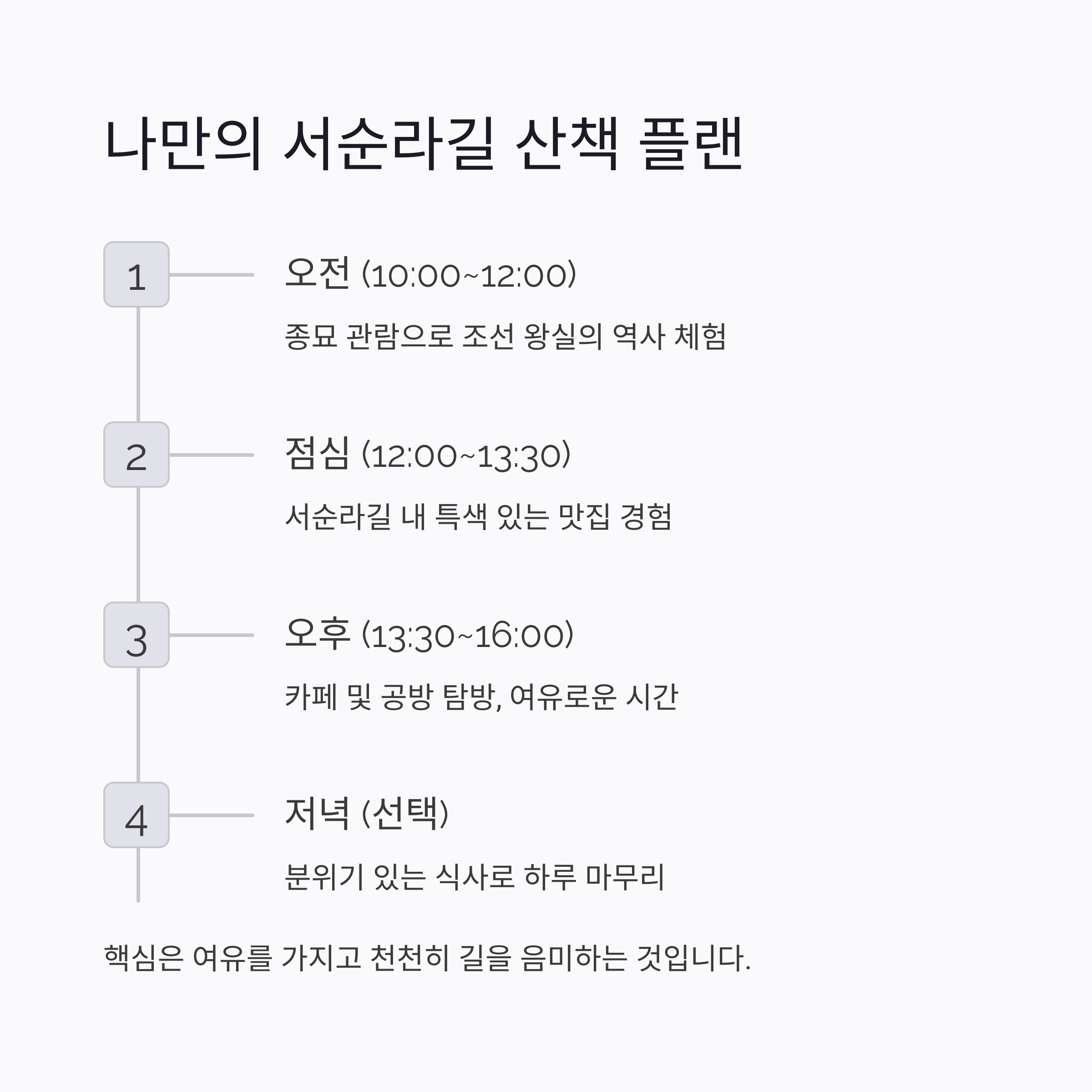 서순라길을 더욱 알차게 즐기기 위한 추천 코스 및 시간 배분 예시입니다.