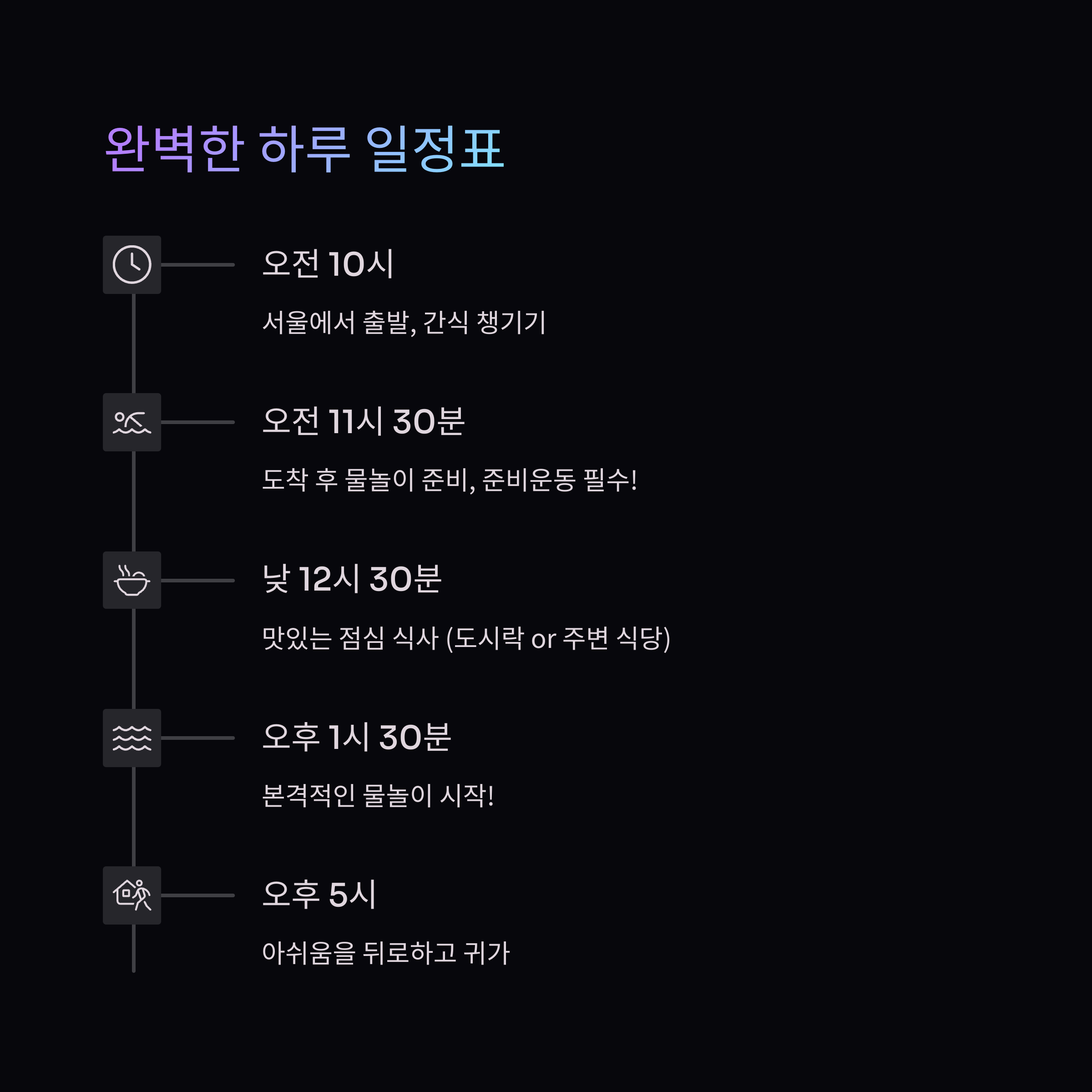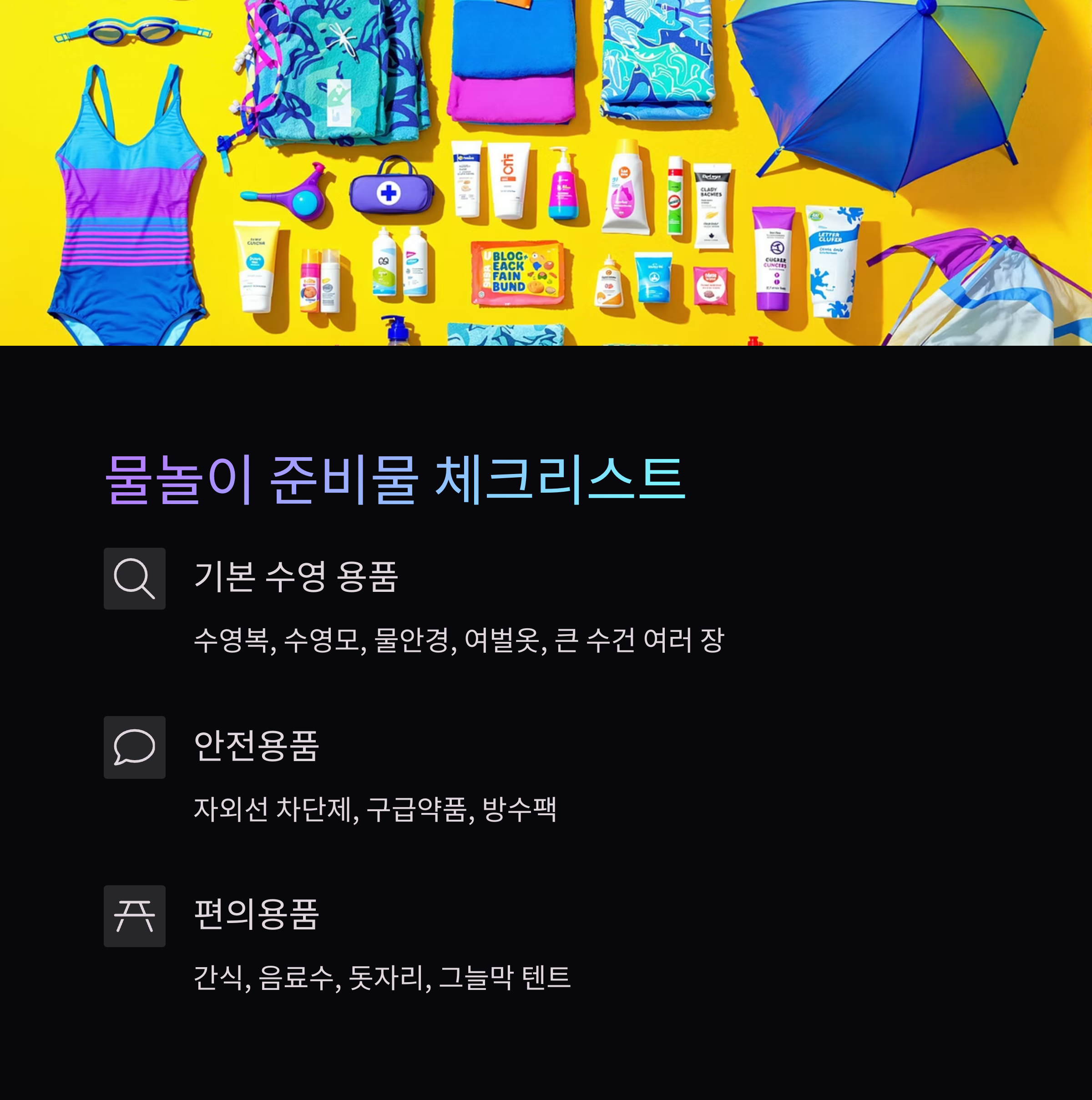 간단한 간식과 음료도 챙겨가면 물놀이 중간중간 에너지를 보충하는 데 도움이 됩니다.