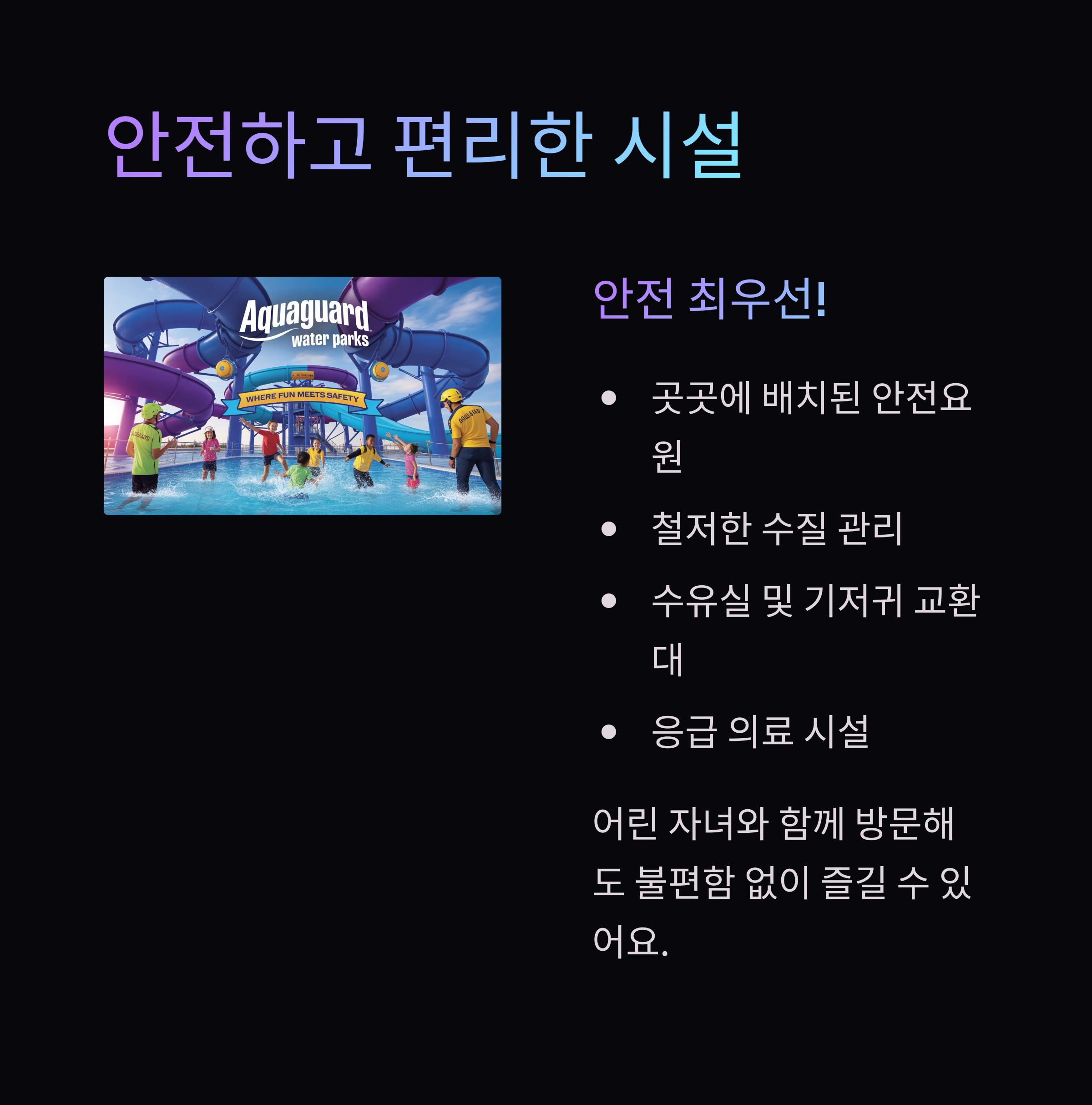 안전하고 쾌적한 물놀이 환경을 제공하여 가족 단위 방문객들에게 인기가 높습니다.
