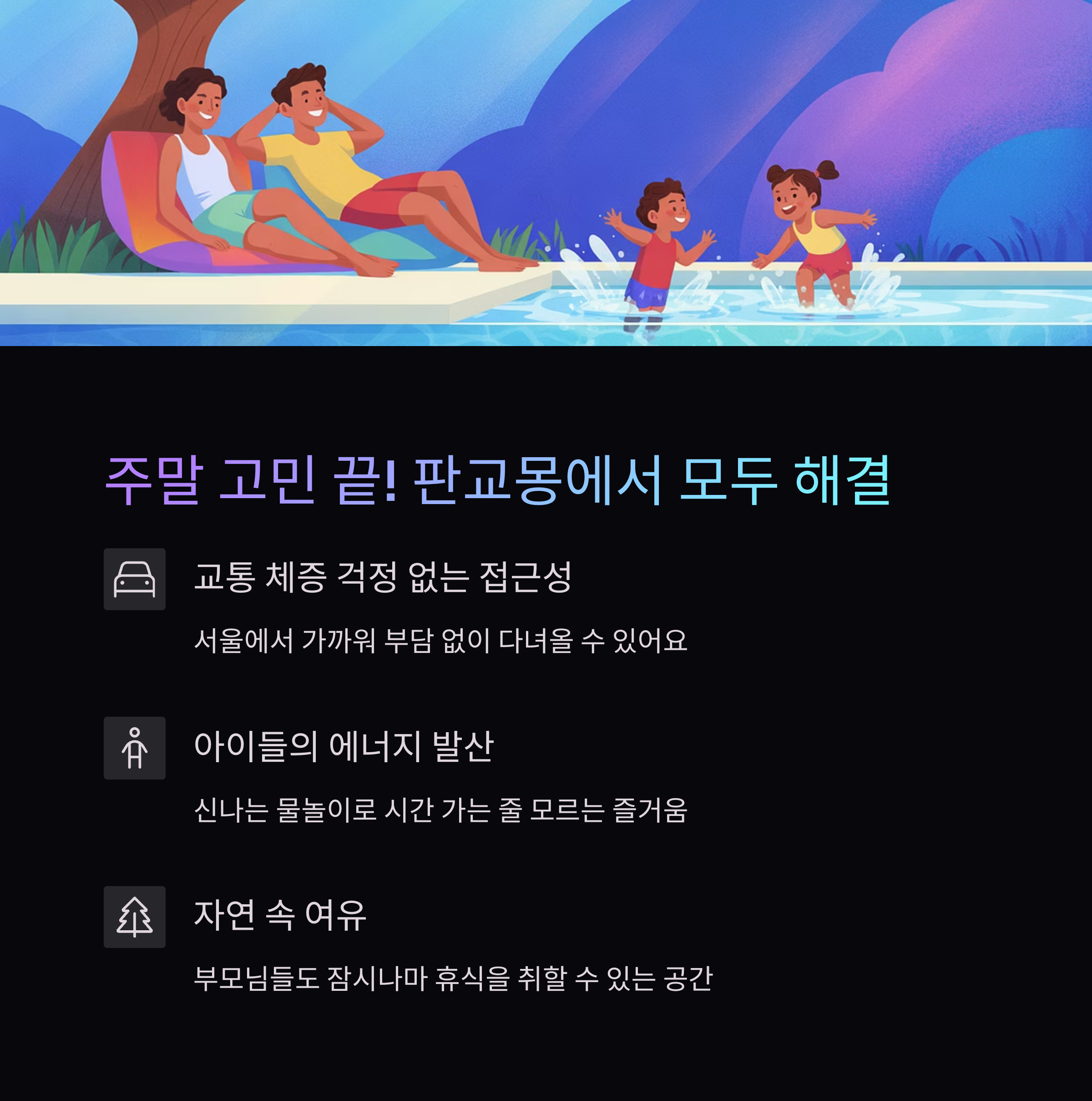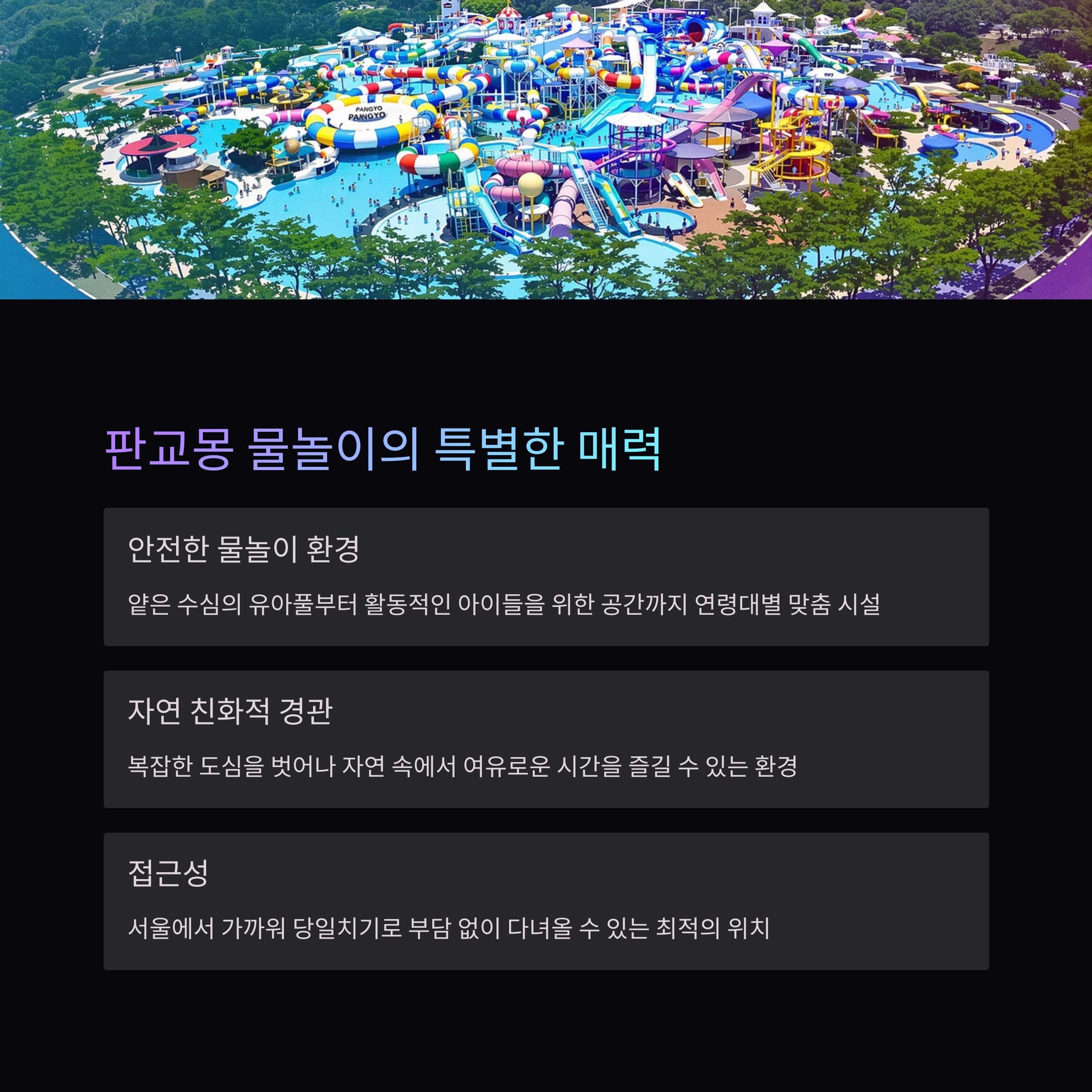 가까운 판교몽에서 시원한 물놀이를 즐기며 잊지 못할 추억을 만들어보세요.