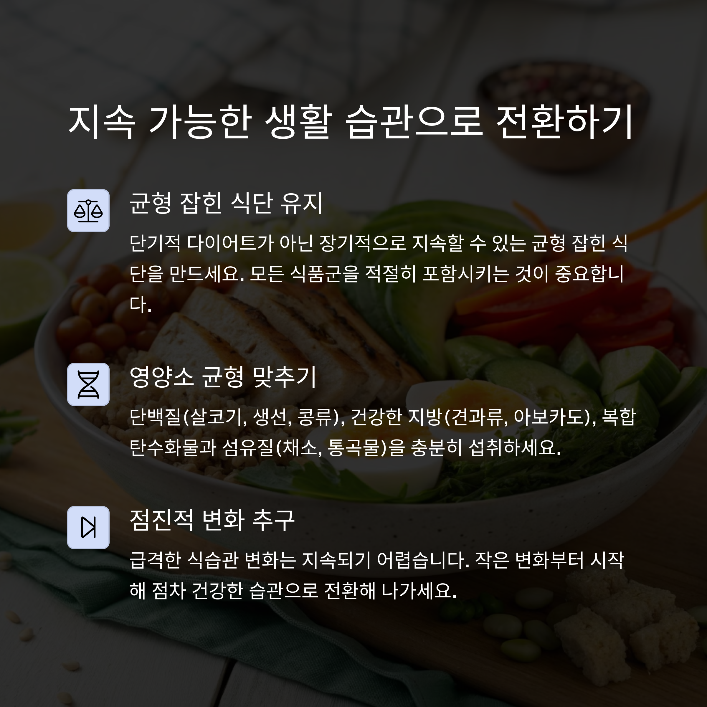 | 단백질 섭취 증가 | 포만감 유지, 근육량 보호 | 고단백 식단이 체중 유지에 효과적 |