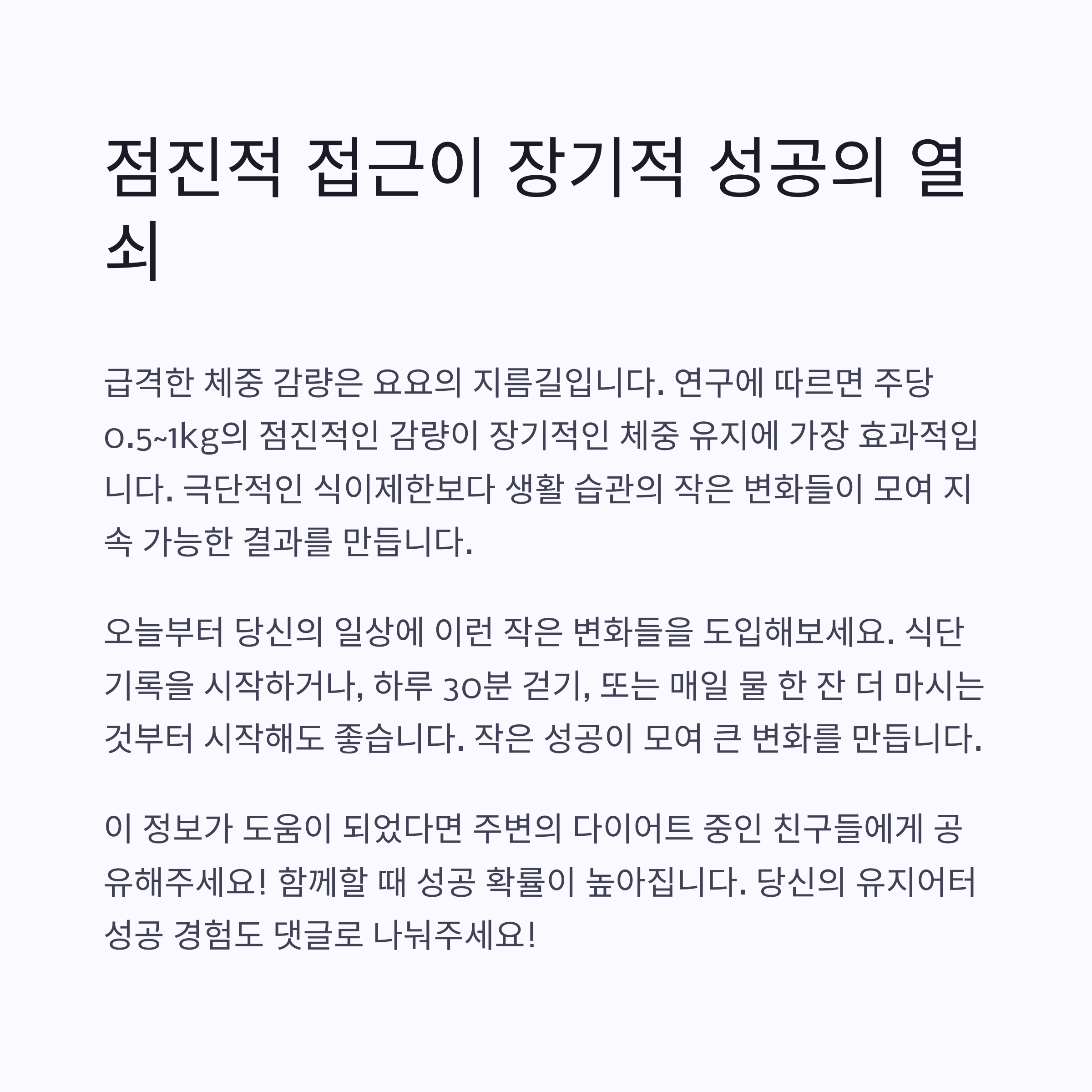 | 체중 유지 성공률 | 지속 가능한 식단과 운동을 실천한 경우, 평균적으로 2~5년 동안 감량 체중의 80% 이상 유지 가능. |