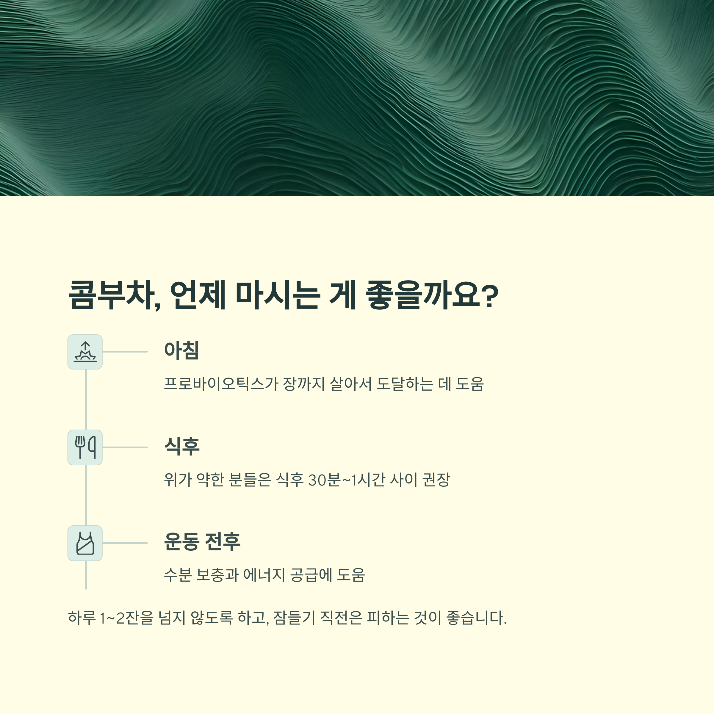 콤부차를 마시는 최적의 시간에 대해 궁금해하는 분들이 많습니다.