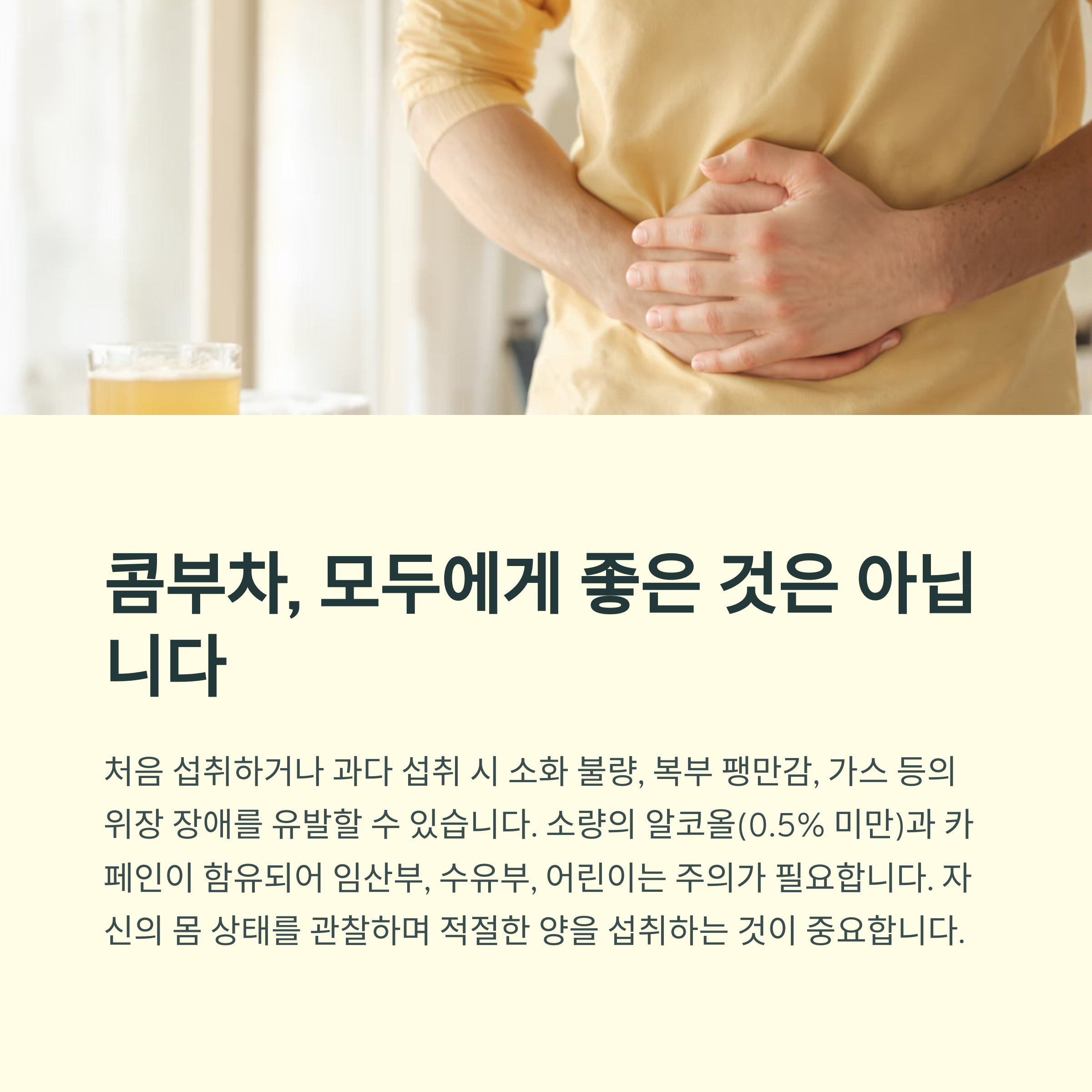 또한, 콤부차는 발효 과정에서 소량의 알코올(보통 0.5% 미만)과 카페인이 함유될 수 있으므로, 임산부, 수유부, 어린이나 특정 질환으로 인해 알코올 및 카페인 섭취에 민감한 분들은 주의가 필요합니다.